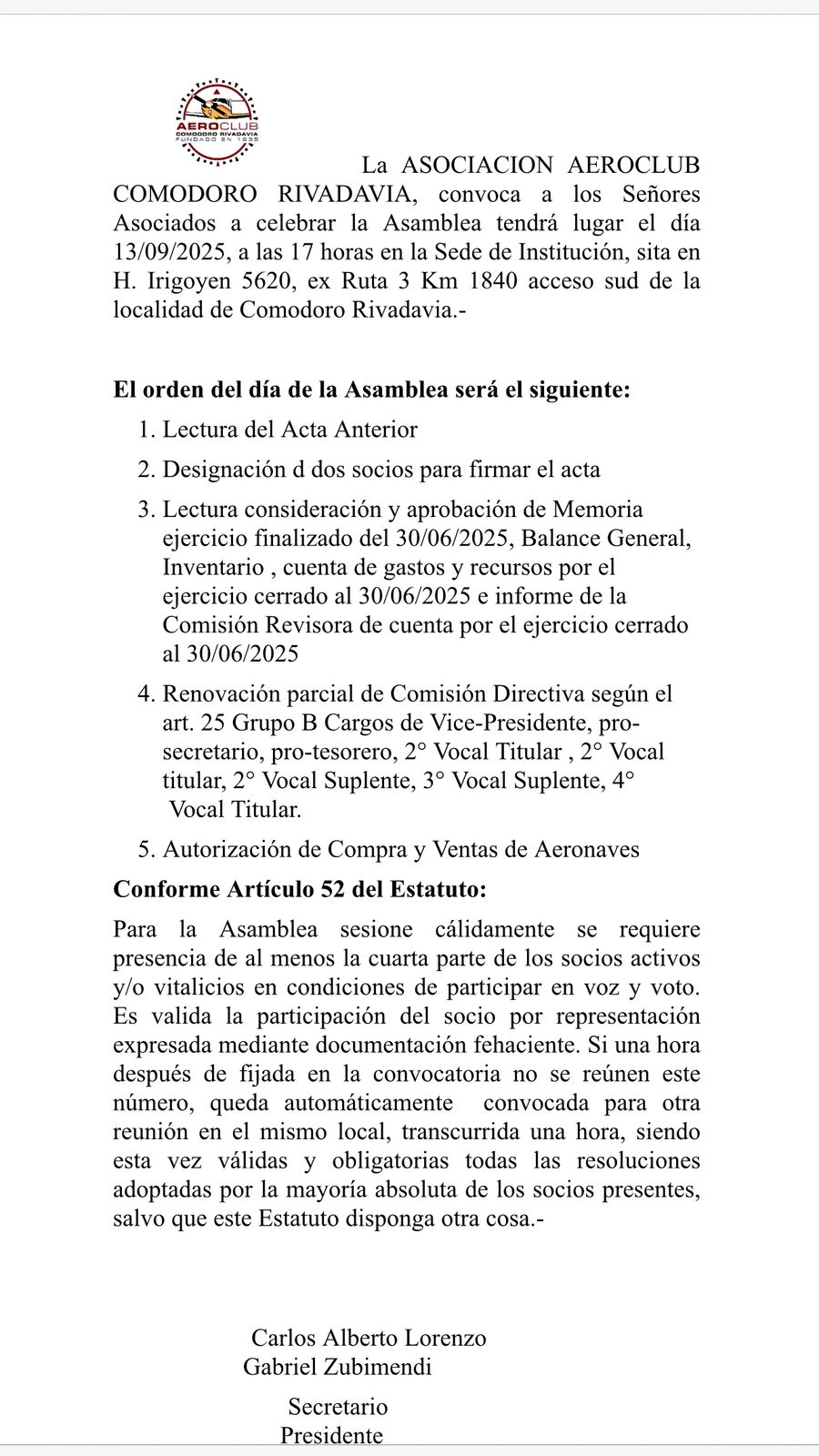 10/10/2024 Llamado a Asamblea General Ordinaria para el dia 19 de Octubre de 2024.
